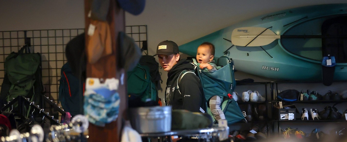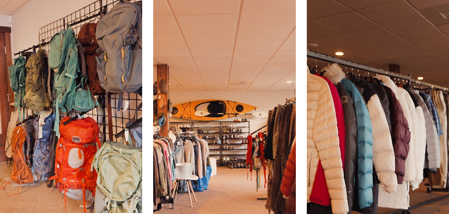 The store stocks outdoor recreation gear and apparel that is clean, functional, and in good condition, with a significant portion being clothes, and popular items such as sleeping bags, backpacks, and winter gear. Additionally, some basic supplies for gear repair and maintenance are also available for purchase, patches, zippers, special lubricants and durable water repellents.