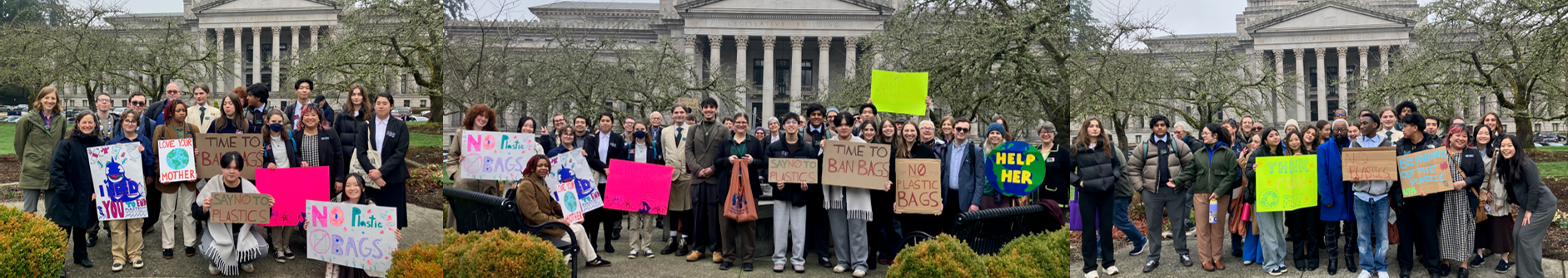 Collage of participants at Plastic-Free Washington lobby day (Jan 19, 2026). Rep. Lisa Parshley (champion of the plastic bag ban bill) is in the center, holding reusable bag. Due to scheduling logistics, we were unable to get everyone in one photo.