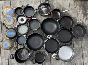 Used nonstick pans collected at swap events. Some of these tested positive for lead contamination.